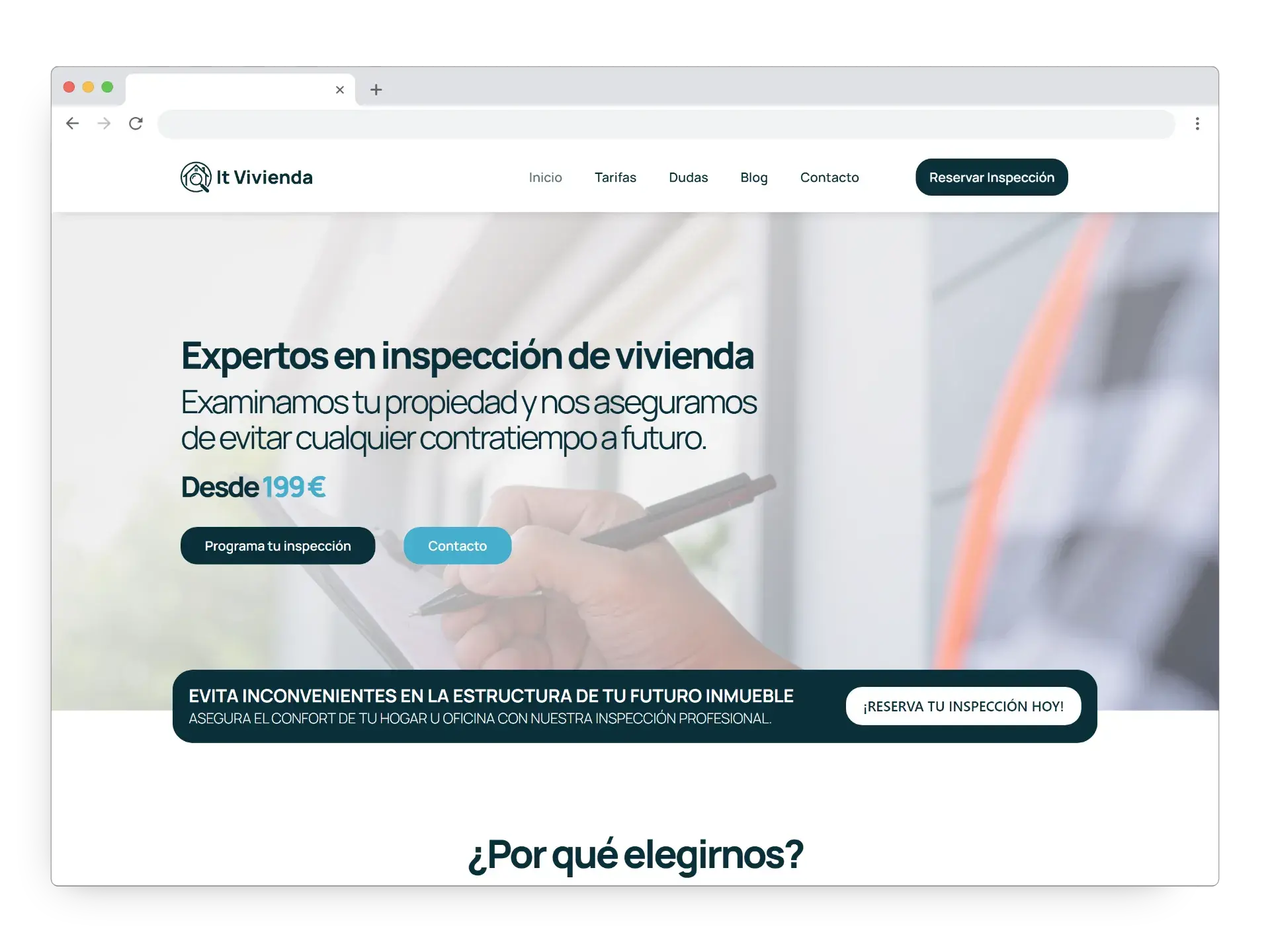 En Calle Digital desarrollamos la web corporativa de IT Vivienda, empresa líder en inspección de viviendas. El objetivo fue crear una plataforma moderna y funcional que transmitiera profesionalismo y ofreciera una experiencia de navegación fluida en cualquier dispositivo. Construida con WordPress y Elementor Pro, la web integra un sistema de reserva online mediante Booknetic, que permite a los usuarios programar inspecciones de forma intuitiva y pagar de manera segura con tarjeta a través de Stripe.