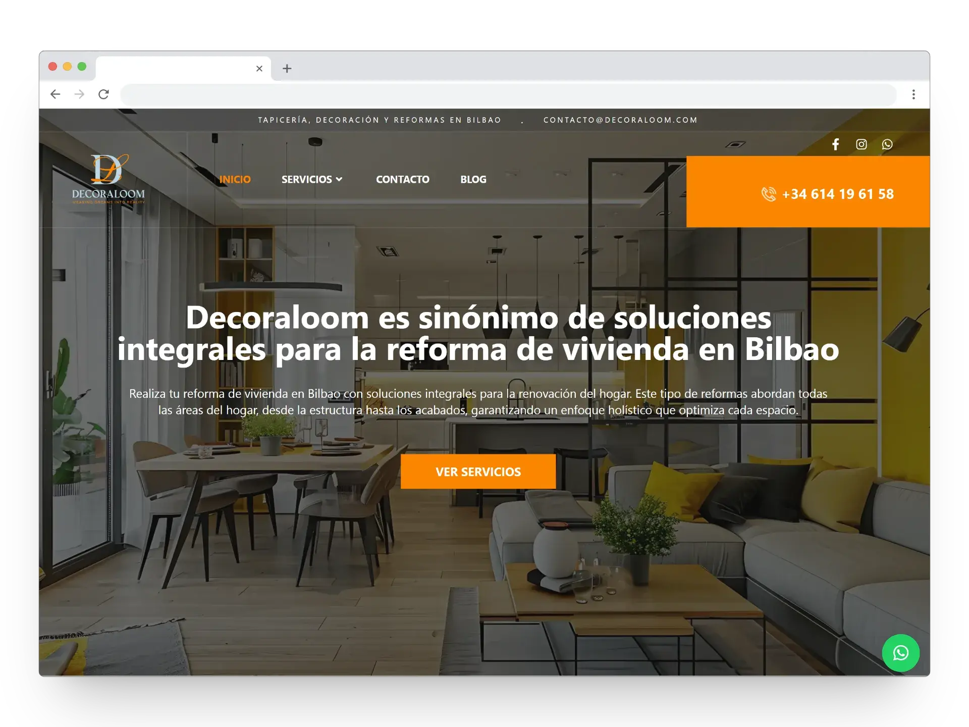 Calle Digital diseñó y desarrolló la web corporativa para Decoraloom, empresa especializada en tapicería y fabricación de sofás personalizados en Bilbao. El objetivo fue crear una presencia online moderna y atractiva que reflejara la calidad artesanal y la versatilidad de sus servicios, optimizando al mismo tiempo la experiencia de navegación y el posicionamiento en buscadores. Construida con WordPress y Elementor Pro, la web ofrece un diseño totalmente responsivo que facilita la navegación desde cualquier dispositivo.