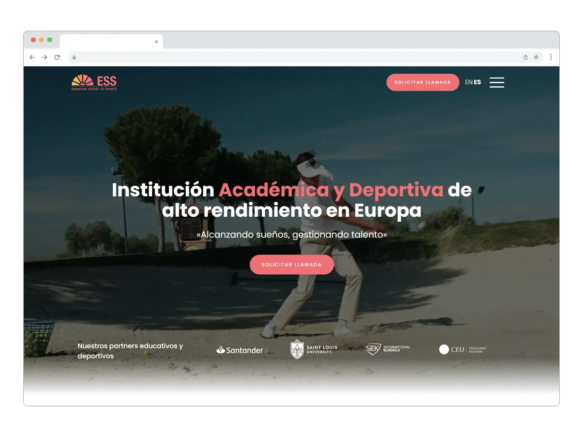 En Calle Digital desarrollamos la web de European School of Sport (ESS), prestigiosa institución académica y deportiva de alto rendimiento en Europa. El objetivo fue reflejar su excelencia y dinamismo mediante un diseño moderno en WordPress con Elementor Pro. Partiendo de un boceto inicial y trabajando en estrecha colaboración con el cliente, creamos una plataforma que destaca sus programas académicos y deportivos de élite, asegurando que el resultado final transmitiera fielmente sus valores y visión.