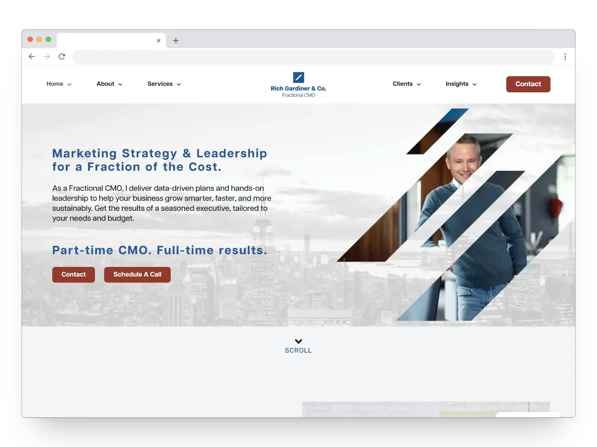 Calle Digital desarrolló un sitio web corporativo para Rich Gardiner, una marca de servicios de Chief Marketing Officer Fraccional. El proyecto utilizó WordPress y Elementor Pro, enfocándose en un diseño moderno, elegante y adaptable a todos los dispositivos.